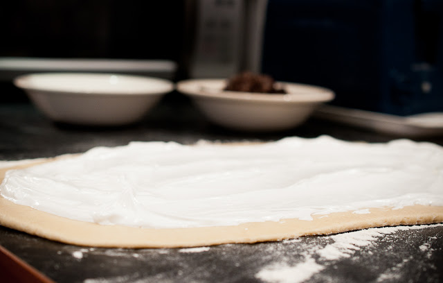 On a lightly floured surface, roll out the dough into a 20 x 10 inch rectangle. Spread the meringue over the rectangle of dough so that it extends evenly across the dough (keep 1/2 inch from the edges clear of the meringue). Sprinkle the filling over the meringue. I alternated between the sugar mixture and the nut/chocolate mixture.